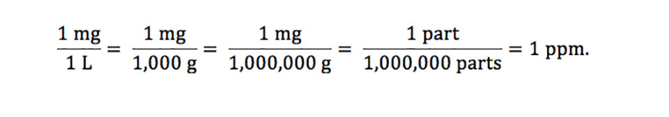 La forma más común de informar las concentraciones de varias variables de calidad del agua es darlas en miligramos por litro (mg/L) o microgramos por litro (mg/L). Por ejemplo, las concentraciones de oxígeno disuelto, alcalinidad total y nitrógeno amoniacal total suelen expresarse en miligramos por litro, mientras que las concentraciones de metales traza se dan con mayor frecuencia en microgramos por litro. Una concentración de 1 mg/L es equivalente a 1 parte por millón (1 ppm) como se muestra a continuación: