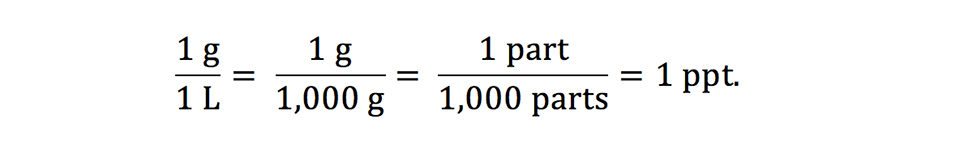 La salinidad a menudo se reporta como partes por mil (ppt), pero también puede reportarse como porcentaje, gramos por litro (g/L) y miligramos por litro. Una parte por mil es lo mismo que 1 g/L, como se ilustra a continuación: