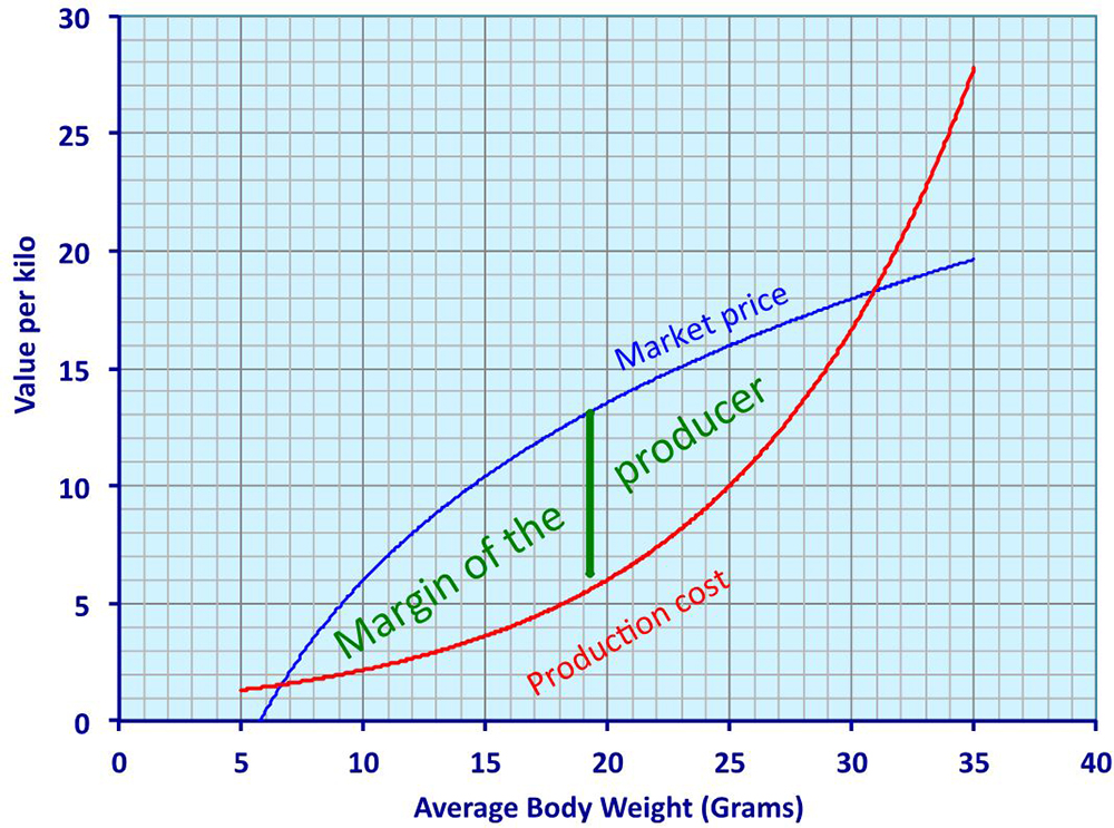 Shrimp farmers decide the date of their harvests mostly based on the optimal average body weight of the shrimp in the particular pond, and considering the market demands and the best prices for given animal sizes. But considering that each market has its preferences and requirements, farmers should strongly guide their decisions not only in terms of unit prices offered to them but also significantly in terms of their potential net margin (Fig. 1), which will depend on the various markets available.