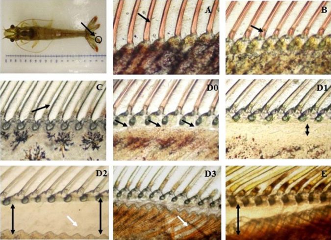 The determination of the intermolt stage is relatively easy and has been described by several authors The easiest way is to observe the endopodites of the shrimp uropods (the equal sides of the tail) using a binocular microscope at a 40× magnification (Fig. 2). The arrow in the top left shrimp picture points to the region of the endopodite of the uropod used for setogenesis (formation of new setae). From stages A to E: