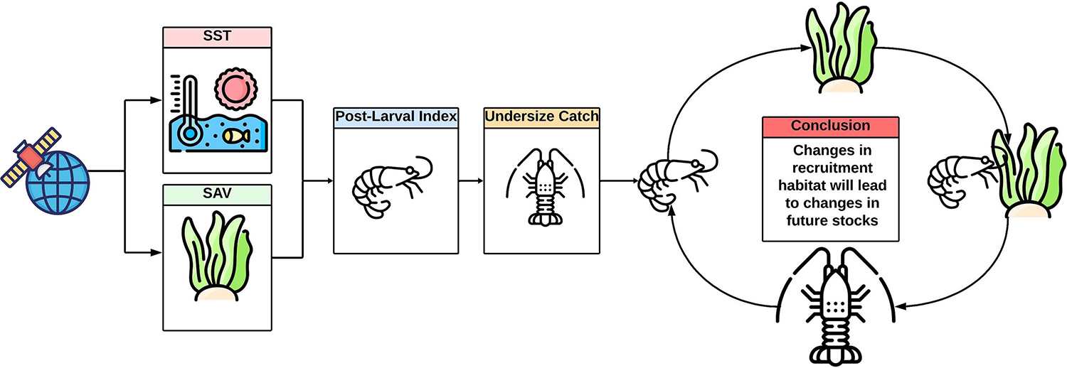 Climate-mediated alterations to critical marine habitats, such as SAV, are hypothesized to have flow-on effects on mammals, fishes and invertebrate assemblages. However, the indirect climate-mediated impact of habitat change on recruitment in invertebrate fisheries has not been systematically quantified across decadal timescales or at regional geographic scales. Despite the relatively recent advent and accessibility of remote sensing imagery, tracking critical fishery habitats across time is challenging and requires historical and standardized marine habitat indices for robust estimates.