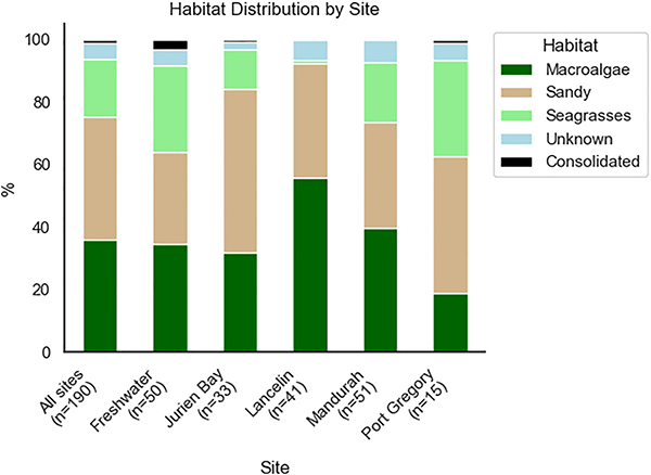 Five study locations were selected along the west coast of Australia, spanning the major fished area for Western rock lobster, and where puerulus settlement is monitored using artificial seaweed stations by the Department of Primary Industries and Regional Development. The study locations used in this research covered 600 km spanning, have a depth range of zero to 30 meters below sea level and predominantly feature the brown macroalgae Ecklonia radiata and unconsolidated (sandy), consolidated (rocky) substrate and seagrasses present at lower abundance.
