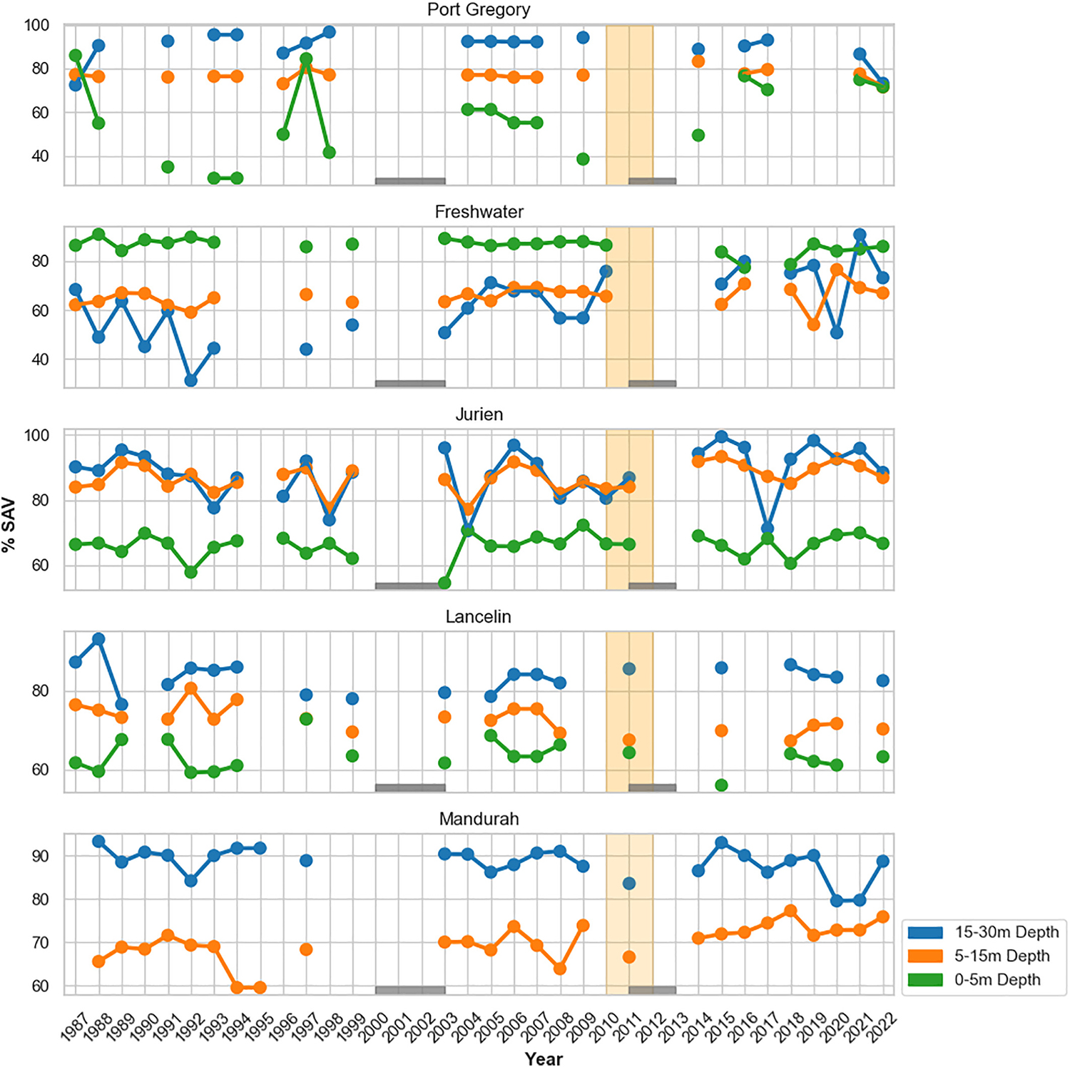 Monitoring using remote sensing is frequently limited by spatial and spectral resolutions of available data, and spatial scale may well be a limiting factor in the work presented here. Though our chosen locations cover a significant area (~410 square kilometers) of coastline, this only represents a subset of likely available WRL recruitment habitats along the West Australian coast. Whole-coast monitoring of SAV may be necessary to determine the effects of habitat on WRL populations and the fishery as a whole. Careful choice of monitoring locations at fine spatial scales may provide better inference as to the true effects of climate. Future work may be able to identify regions of thermal refugia or regions experiencing extreme temperature fluctuations where loss or gain of SAV may be directly related to temperature anomalies.
