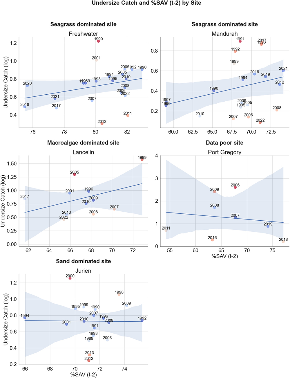 Despite the limitations in remotely sensed and undersize catch data, Freshwater, Mandurah and Lancelin showed a significant positive relationship between undersize catch and previous years of SAV. In contrast, Jurien, the most sand-dominated location, and Port Gregory, the location that lacked usable satellite and benthic imagery and catch data, showed no relationship between undersize catch and SAV.