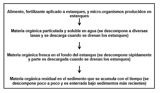 Las principales fuentes de materia orgánica en los estanques acuícolas son fertilizantes orgánicos, restos de microorganismos – fitoplancton, zooplancton, y bentos – producidos dentro del estanque, las heces de los animales de cultivo, y el alimento no consumido. Una proporción relativamente pequeña del aporte de materia orgánica total a los estanques (por lo general menos de 10 por ciento) se recupera en forma de peces cosechados, camarones u otros animales de cultivo. El resto de la materia orgánica se convierte en dióxido de carbono y agua por la respiración de las especies de cultivo y otra biota del estanque, son descargados en efluentes de estanques, o se acumulan en el sedimento.