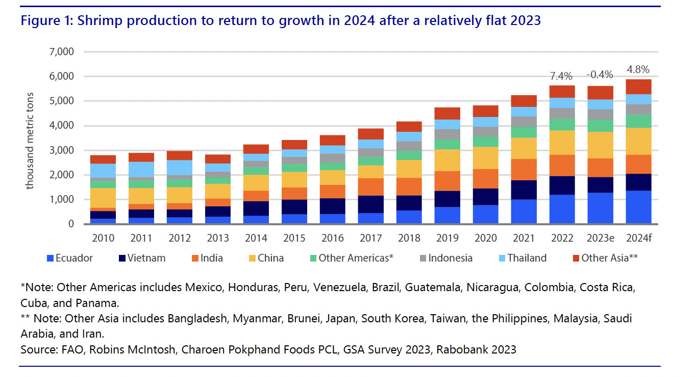 Hay optimismo sobre la producción Asiática de camarón, y los encuestados pronostican una recuperación potencial del 4 por ciento en 2024, tras la primera caída de la región en una década en 2023.