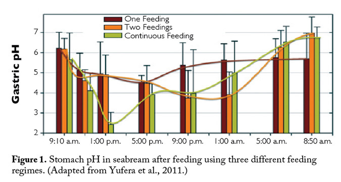 The authors speculated that the buffering capacity of the feed was a major contributor to the increased pH of the gastric fluids. It took the fish more than 24 hours to reach the “low” initial pH of the stomach.