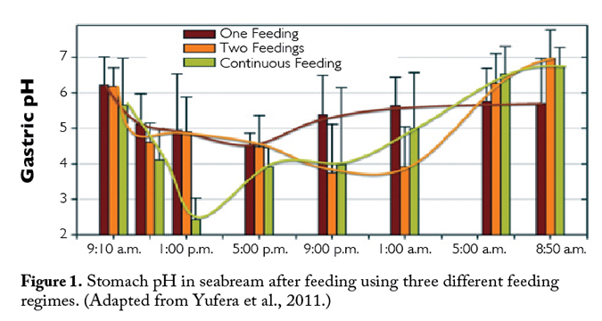 A subsequent study from Yufera’s group in 2012 took this a step further. This time, the authors looked at the connection between stomach pH and pepsin activity in juvenile marine fish. Fish were again fed a single meal, twice or continuously with the same diet at the same times as mentioned above.
