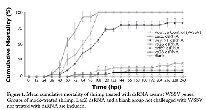 The authors therefore established a study to evaluate the antiviral efficacy of double-stranded (ds)RNA against non-structural WSSV genes orf89 and wsv191 in Pacific white shrimp (Litopenaeus vannamei) and compare it to dsRNA against WSSV genes vp28 and vp26 under experimental conditions.