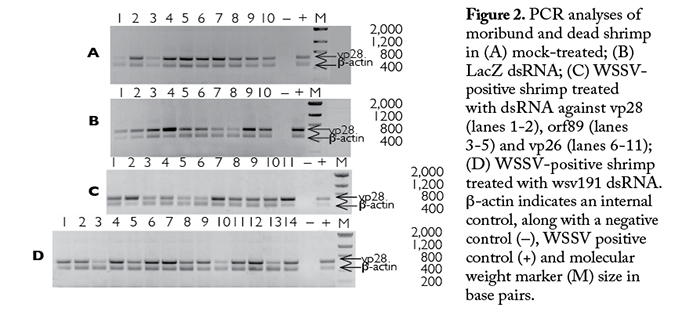 A group was treated with 40 µL dsRNA against bacterial LacZ gene and used as a control. Another group of 10 shrimp was mock treated with 40 µL phosphate-buffered saline and used as a positive control. Three replicates were done per treatment.