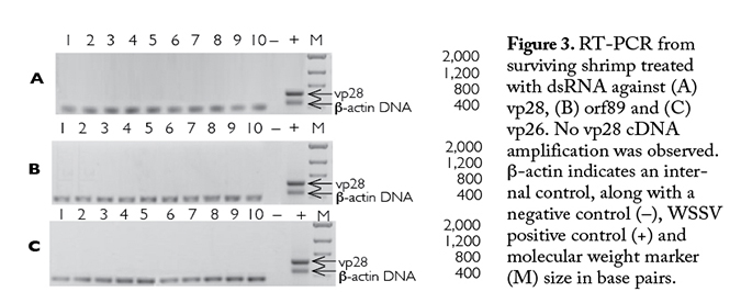 Shrimp treated with dsRNA against vp28 and vp26 were protected against a highly lethal WSSV challenge. Genes vp28 and vp26 encode structural proteins VP28 and VP26, which have been shown to play important roles in virion structure, virus attachment and infection.