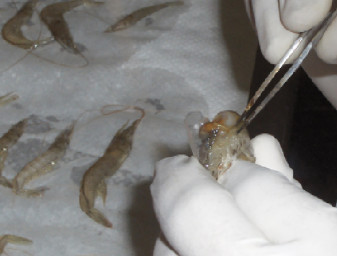 Juvenile shrimp from a hatchery in Sonora, Mexico, were tested WSSV-negative by polymerase chain reaction (PCR) analyses. The animals were maintained in artificial seawater with a salinity of 25 g/L, temperature of 27 ± 2 degrees-C and continuous aeration. Fifty percent water exchange was done every third day to maintain good water quality.