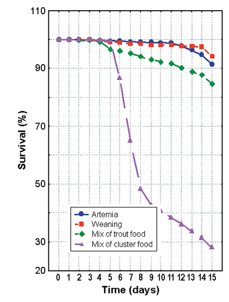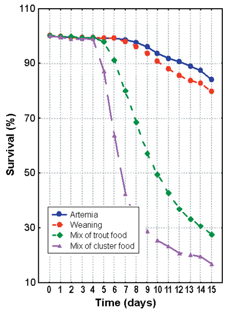 Cofeeding the larvae with artemia and artificial diet resulted in very low survival, both in fresh (19.2 percent) and saline water (31.3 percent). Cofeeding with artemia and trout starter produced relatively low survival in freshwater, because after 15 days only 31.8 percent of the larvae were still alive. In saline water, however, the survival rate was 88.1 percent after 15 days.