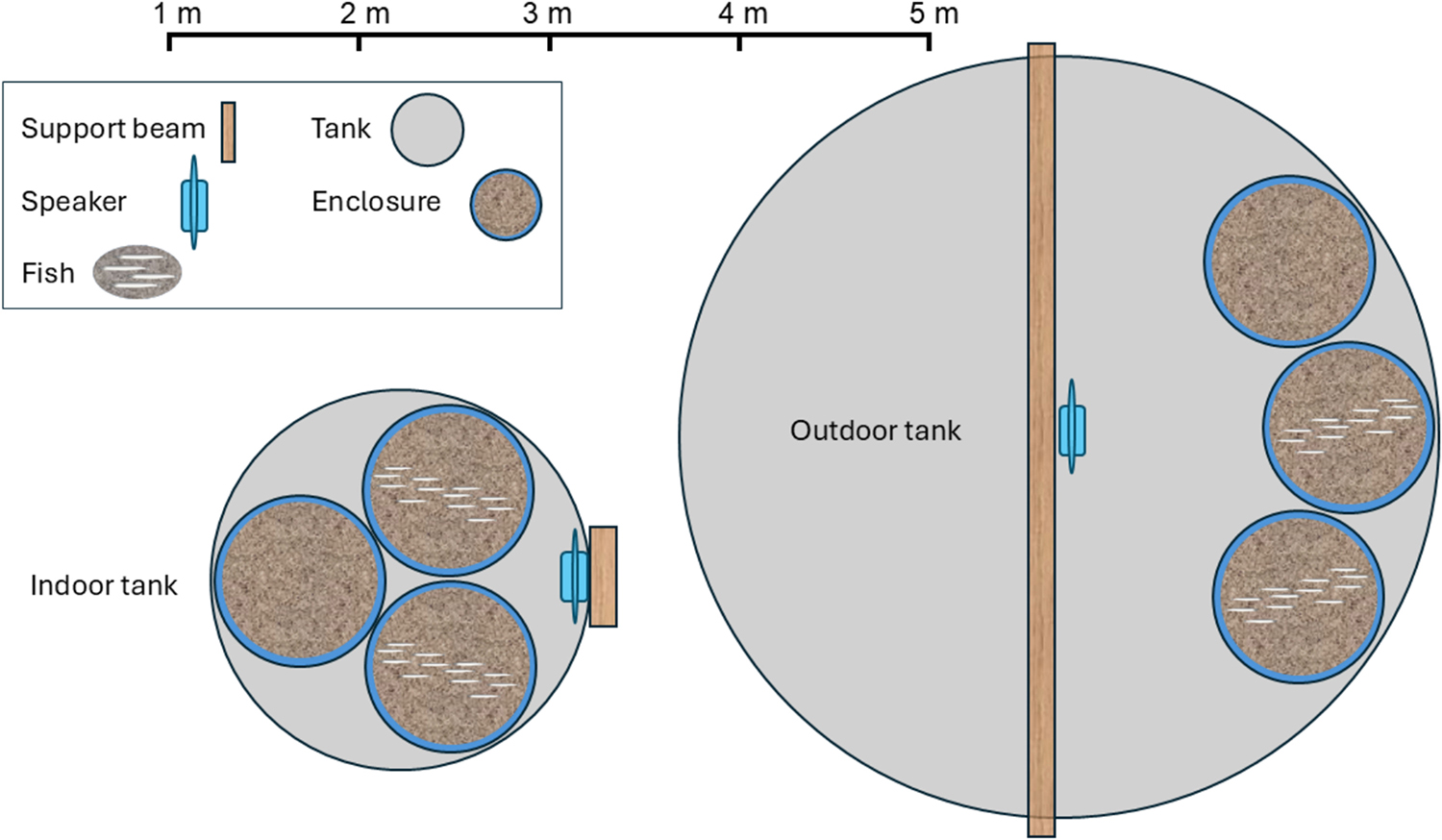 Using playback recordings, how different types of anthropogenic noise may affect PSL energy density – a key measure of food quality – for their predators, were investigated. A total of 345 PSL were collected with various nets at Jackson Beach and Eagle Cove on San Juan Island, WA, USA and transported to Friday Harbor Labs (FHL, University of Washington, Wash., USA). The fish were held in water-permeable circular enclosures (0.9 meters high x 0.8 meters diameter) within a larger concrete circular holding tank, indoors and outdoors (Fig. 1). The inside tanks were in a room with full windows on one side and experienced the same photoperiod as the outside tanks which were under a gazebo-like structure. The bottom of each circular enclosure had ~10–15 cm of sand collected from Jackson Beach (a location where PSL are known to bury throughout the year) to allow the PSL to bury as they do in the wild.
