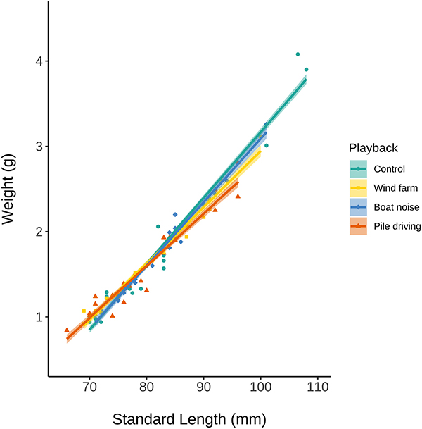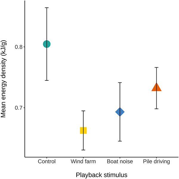 Fish in acoustic environments with anthropogenic noise playbacks had lower energy density (exposure to wind farm and boat noise) and reduced weight-at-length (exposure to wind farm and pile driving) compared to controls. These results suggest that PSL exposed to noise are of lower quality to their marine predators. As PSL are such an important food source for so many marine predators, especially breeding Alcids, decreases in PSL quality could have long-term and far-reaching effects on the marine predators that rely on them. While this experiment does have a clear result, it was intended to be a pilot experiment and therefore primarily serves to open further specific lines of inquiry regarding the effects of noise on PSL as an important source or prey, specifically in terms of habituation, behavior, and noise sources with trophic cascade implications.