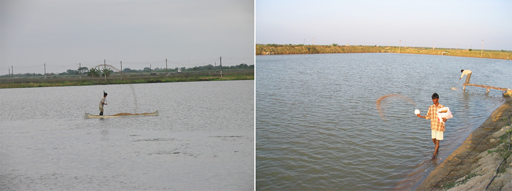 Al principio del ciclo de crecimiento es importante distribuir el alimento uniformemente por todo el estanque. En muchas granjas con estanques más grandes (< 3-4 ha), la alimentación se realiza desde embarcaciones que siguen patrones establecidos generalmente marcados en todo el estanque. Pero a medida que el ciclo progresa, los gerentes deben estar conscientes de que el camarón reaccionará a la variación de los cambios de los microhábitats en el estanque, tanto en el espacio como en el tiempo.