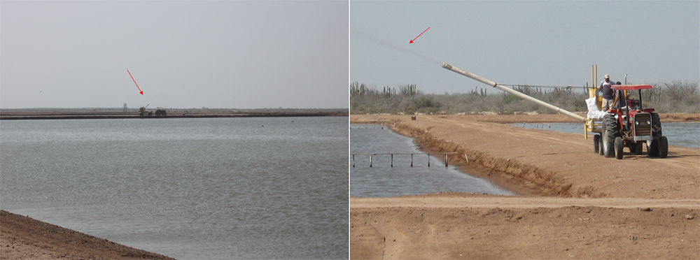Además, muchos camarones se moverán a áreas más profundas dentro de un estanque durante el día para evitar la luz. Por lo tanto, las áreas muy poco profundas o aquellas con sedimentos anaeróbicos no deben recibir ningún alimento durante las horas diurnas, ya que es poco probable que el camarón lo consuma. Sin embargo, también es importante considerar que la distribución del camarón en los estanques no es generalmente uniforme, y que varios factores pueden influir en cómo los animales se distribuyen en estanques. Estas y otras consideraciones deben tenerse en cuenta al distribuir el alimento en los estanques