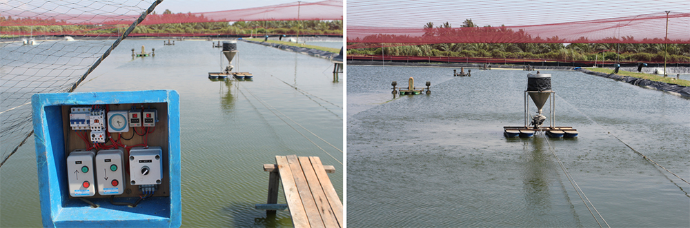 Alimentadores automáticos como el que se muestra a continuación están ganando popularidad en varios de los principales países productores de camarón en Asia. En este momento su uso es relativamente limitado en otros lugares. Algunos de los beneficios reportados por estos alimentadores automáticos incluyen una reducción significativa en el índice de conversión alimenticia (FCR), un crecimiento diario promedio mejorado, un tamaño más uniforme del camarón, menos daño físico a las cáscaras de camarón, mejor calidad del agua del estanque y menor mano de obra requerida para distribuir el alimento en los estanques.