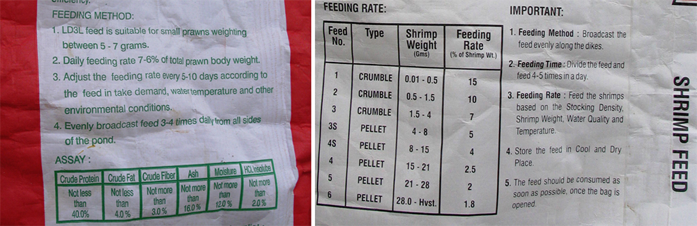 Las tasas de alimentación se ajustan basándose en el muestreo poblacional y el monitoreo de parámetros ambientales como la temperatura del agua, el oxígeno disuelto y otros parámetros del agua, el uso de bandejas de alimentación y la experiencia. Las tasas se ajustan periódicamente (generalmente semanalmente) sobre la base de estimaciones de muestreo para el peso corporal medio individual, la distribución del tamaño de la población y la biomasa del camarón del estanque. A medida que los animales crecen, las cantidades de alimento utilizadas disminuyen como porcentaje de la biomasa total de camarón, pero la cantidad total de alimento aumenta proporcionalmente con el aumento de la biomasa de camarón.