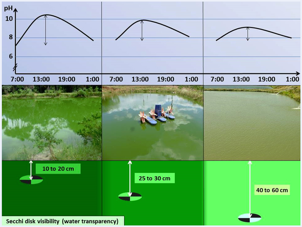 Sin embargo, al igual que con el oxígeno disuelto, los valores de pH del agua pueden experimentar grandes fluctuaciones durante el día en estanques de agua verde (Fig. 2). Los valores de pH cercanos o superiores a 9,0 son bastante comunes durante las horas de la tarde, debido a la intensa actividad de fotosíntesis de las microalgas (fitoplancton), incluso en estanques con aguas bien amortiguadas (es decir, aguas ricas en carbonatos y bicarbonatos y, por lo tanto, de alta titulación de alcalinidad total y capaces de mantener valores de pH más estables). El pH extremo, por sí solo, deprime la actividad alimentaria, reduce el crecimiento, afecta negativamente el FCR y suprime la respuesta inmune de los peces y camarones cultivados.