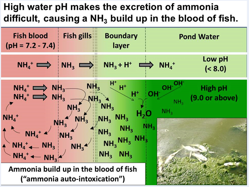 Como los estanques de criadero son a menudo someros y tienen tasas de respiración muy por debajo de la tasa de fotosíntesis, la condición de alto pH persiste durante la mayor parte de la noche, no proporcionando a los peces mucho alivio u oportunidad de reanudar la excreción normal de amoníaco. La auto-intoxicación por amoníaco se agrava aún más por la alimentación excesiva y/o el uso de alimentos ricos en proteínas, una práctica común en muchos criaderos de peces. Los productores rara vez relacionan tales mortalidades con la toxicidad del amoníaco, ya que el amoníaco está prácticamente ausente del agua del estanque debido a su rápida eliminación por las microalgas que lo utilizan como una fuente de nitrógeno. Las lecturas de amoniaco usando un kit de prueba a menudo muestran cero amoníaco total en el agua. Sin embargo, el amoníaco endógeno se acumula en la sangre de los peces, causando estrés y mortalidad.