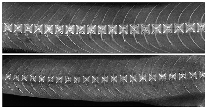 En la conclusión del período experimental, se esperaba que habrían varias malformaciones de la columna vertebral de una lista de patologías previamente publicadas (Aquaculture 2009, 295: 6-14). En cambio, todos los animales en el grupo experimental y en el grupo control tenían espinas perfectamente rectas. Sin embargo, la comparación con radiografías de espinas de los animales de control mostraron cuerpos vertebrales más pequeños y espaciados más ampliamente en los peces alimentados con la dieta baja en fósforo (Figura 1).