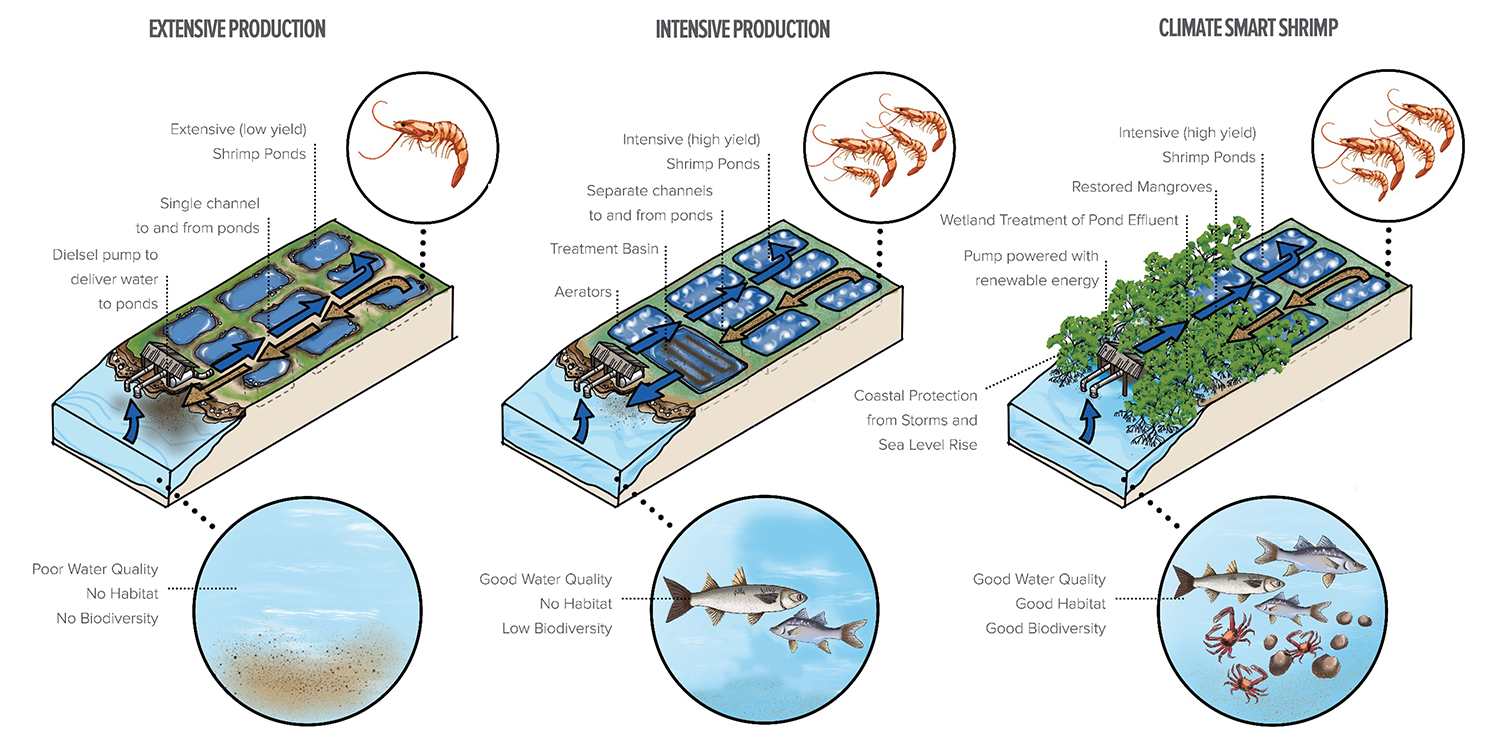 En Ecuador e Indonesia, la ONG Conservation International basada en los EE. UU. trabaja con camaronicultores para aumentar la producción en una parte de sus tierras y restaurar los manglares en el resto.