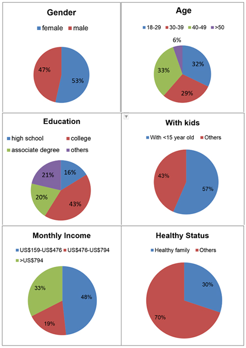 Estructura familiar: Más de la mitad de los encuestados (56,6 por ciento) tiene hijos menores de 15 años y el 43,7 por ciento de los encuestados tienen ancianos en los hogares. Esto es consistente con las estadísticas nacionales. Se estima que los hogares con ancianos o niños pueden prestar más atención a los problemas de calidad e inocuidad de alimentos.