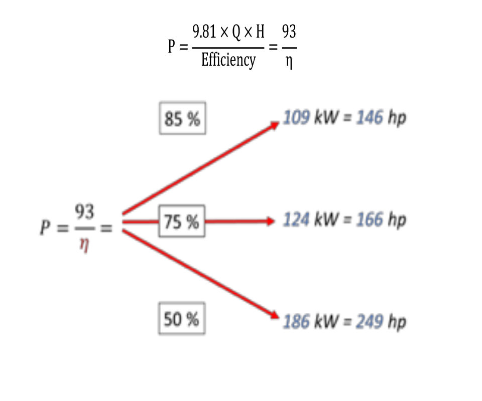 As our example shows, as the efficiency of the pump increases, the required power of the motor decreases; therefore, the power consumption of the motor is reduced.