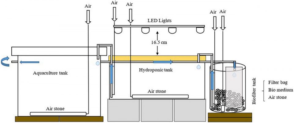 Se construyeron dieciocho sistemas acuapónicos individuales en el Laboratorio de Investigación de Acuacultura de la Universidad de Purdue (IN, EE. UU.). Cada sistema tenía un tanque de acuacultura (113,6 litros), un tanque hidropónico (102,2 litros) y un tanque de biofiltro (18,9 litros; Fig. 1).