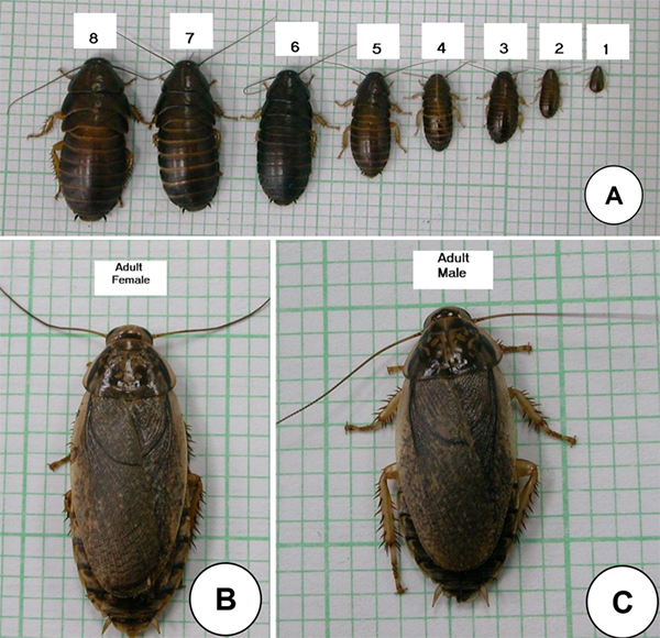 The lobster cockroach (Nauphoeta cinerea) is a tropical and subtropical species with a wide distribution. It is easy to maintain as it does not glide despite having wings in its adult stage. It belongs to the family Blaberidae and is the sole representative of its genus. Females are highly fecund and are ovoviviparous, incubating the ootheca (egg capsules) in the abdomen until the nymphs emerge. Nymphs undergo incomplete metamorphosis (eight instar stages) before emerging as adults, bypassing the pupal stage (Fig. 1). Nymphs have thin exoskeletons and are wingless.