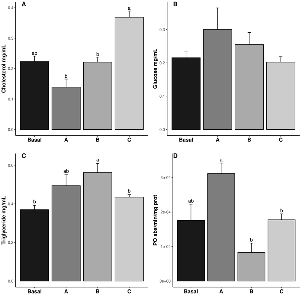 Findings showed that the lowest plasma cholesterol level was observed in shrimp fed diets A (0.322 grams per kg) and B (0.628 grams per kg), suggesting an increase in cholesterol metabolism compared to those fed the Basal and C diets. The elevated plasma cholesterol concentration in shrimp fed the Basal and C diets may be associated with low recognition by cholesterol receptors, potentially due to peroxidation modification resulting from either an excess or deficiency of vitamin C.