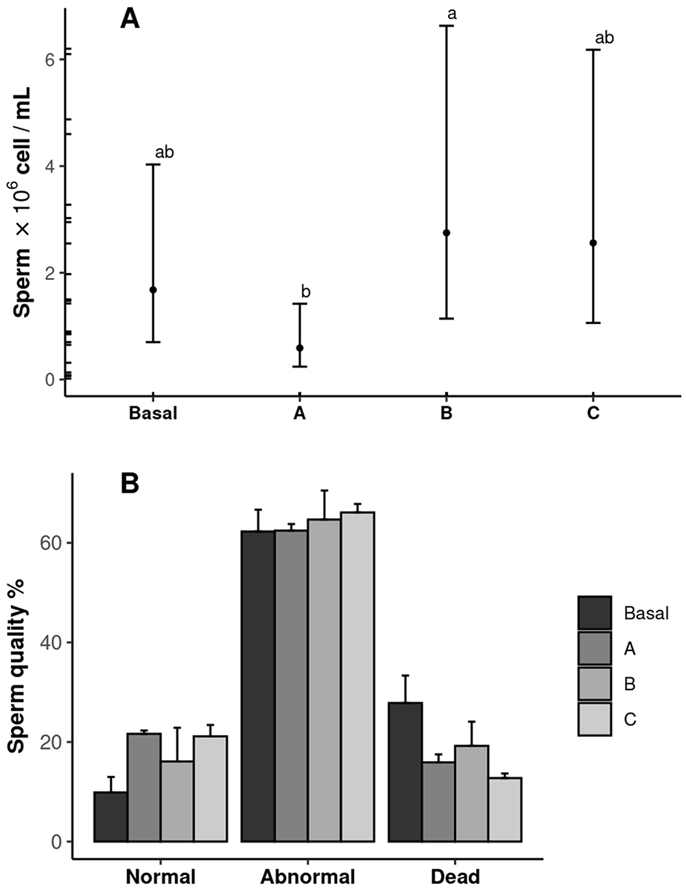 The observed differences in sperm cell quantity among the treatments indicate that vitamin C plays a significant role in the reproductive aspects of male P. vannamei broodstock. On the other hand, it is noteworthy that no significant differences were observed in sperm cell quality, despite the differences in quantity, as previously reported in P. brasiliensis.