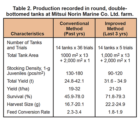 In 1973, the new farm of Mitsui Norin Marine Co. Ltd. was established on the southern tip of mainland Japan. It used 14 round, double-bottomed tanks built after Shigueno’s design. He knew from previous experience that this system was more productive than the conventional pond system, although the initial cost is higher (Fig. 1). The merits of this system, including easier water exchange, draining of sludge, and maintenance of the aerobic sand bed filter, contributed to the increased production.