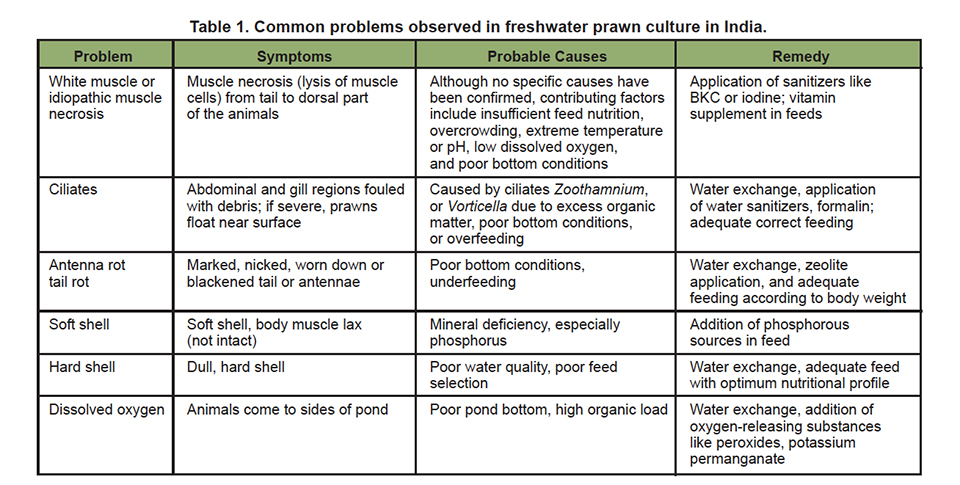 Table 1 presents various disease and production-related problems observed in freshwater prawn farming in India, along with their probable causes and solutions attempted by the farmers.