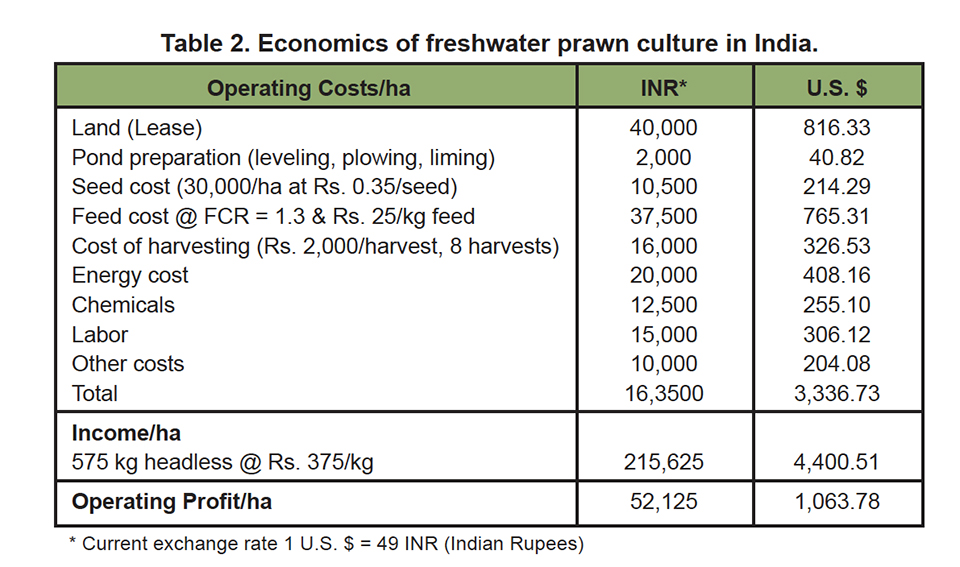 Table 2 presents a typical scenario of costs and income for a freshwater prawn culture operation in the state of Andhra Pradesh. An operating income close to U.S. $1,000 per hectare per crop is possible for a well-managed farm. However, prawn prices fluctuate widely and affect the profitability of India’s culture operations.