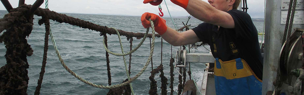 “Nuestro primer año fue un ensayo a pequeña escala con tres líneas de cabeza para comprobar si el equipo podría sobrevivir en alta mar, ya sea que pudiéramos o no recolectar semilla ocurriendo naturalmente, y si podríamos engordar la semilla durante el invierno sin que los mejillones se desprendieran. La respuesta a las tres fue que sí,” dijo John Holmyard.