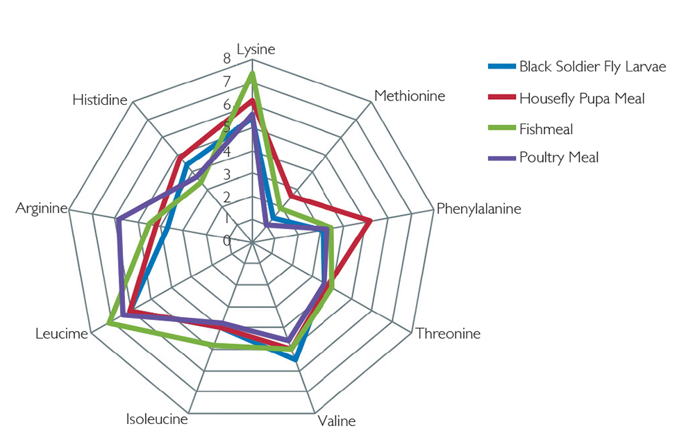 Similarly, the amino acid composition of insect meals differs largely among species. High amino acid values for phenylalanine and tyrosine have been found in some species, and some insects are rich in tryptophan, lysine and threonine (Figure 1). However, the analytical data suggest that for insects, total sulfur amino acids are first limiting, and when insect meals are incorporated into aquaculture diets as the primary source of protein, total sulfur amino acids were shown to be the first limiting amino acid.