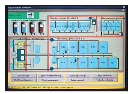 - Automated and direct measurement of all relevant water quality parameters (oxygen, temperature, pH and others), and inputs (heating energy, electrical energy, oxygen consumption and food supply). All parameters can reviewed on a computer screen, and trends can be compared over any period of time. This precise evaluation of important economic parameters supports profitable production by reducing variable costs and maximizing utilization of input factors.