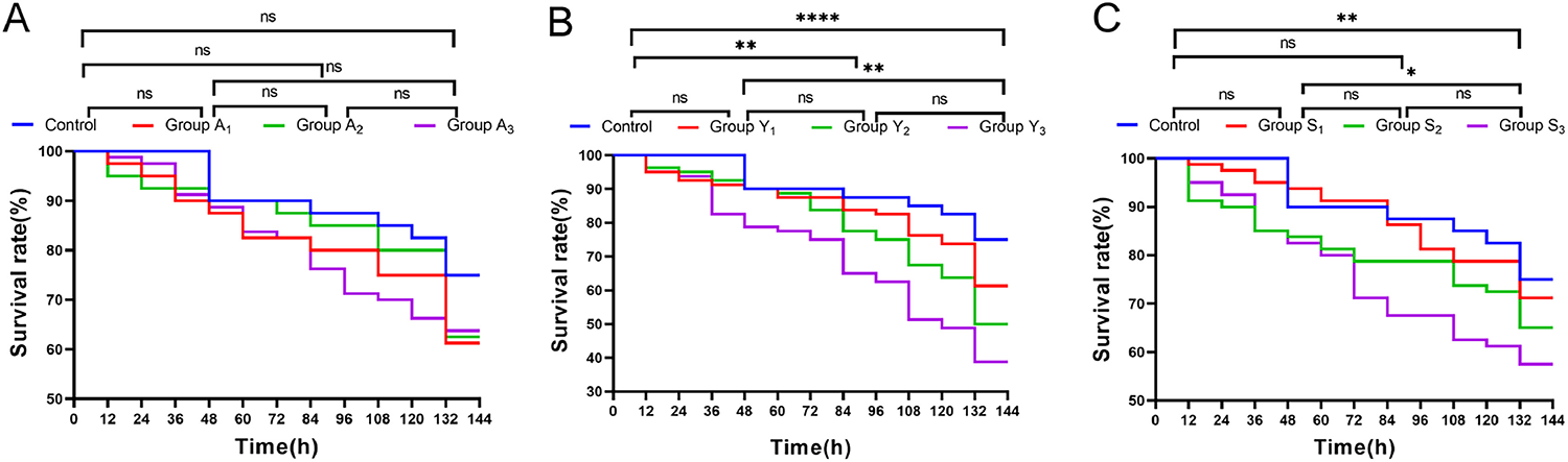 The cumulative survival of L. vannamei under different concentrations of ammonia nitrogen stress, nitrite stress, and sulfide stress is shown in Fig. 1A-C. Survival typically declined gradually for all groups as the stress time increased, with significant reductions in survival observed between 120 h and 132 h for several of the experimental treatments, and often significantly lower than for the control group.