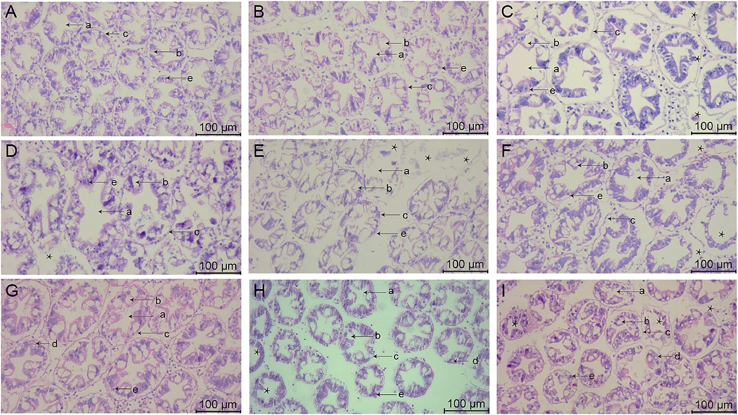 The hepatopancreas is the largest immune organ of shrimp. Its main function is digestion, absorption and storage of nutrients, and plays a key role in maintaining the metabolic balance of shrimp and eliminating toxic pollutants. Significant damage was observed in the hepatopancreas under the stress of the three environmental factors, which may be attributed to the greater burden on the hepatopancreas in balancing and clearing the pollutants, resulting in damage to its tissue structure.