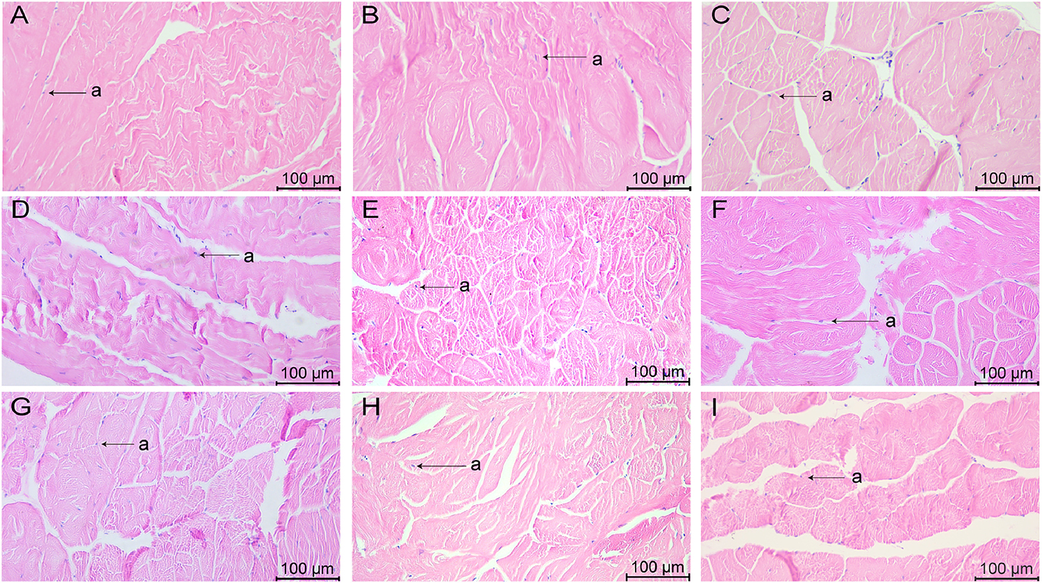 High quality of meat is an important motivation for consumers to buy, so the muscle quality of their L. vannamei shrimp is critical for the farmers. Our data showed that all three concentrations of nitrite caused the muscle to break into pieces, with uneven distribution of nuclei and nuclear agglutination, indicating that all the three concentrations of nitrite caused severe damage to the muscle. The muscles under three different concentrations of sulfide stress underwent muscle fiber fragmentation and rupture, and the degree of muscle fragmentation in the S3 group was more serious than that in the S1 and S2 groups, indicating that the higher the concentration of sulfide, the greater the damage to the muscle.