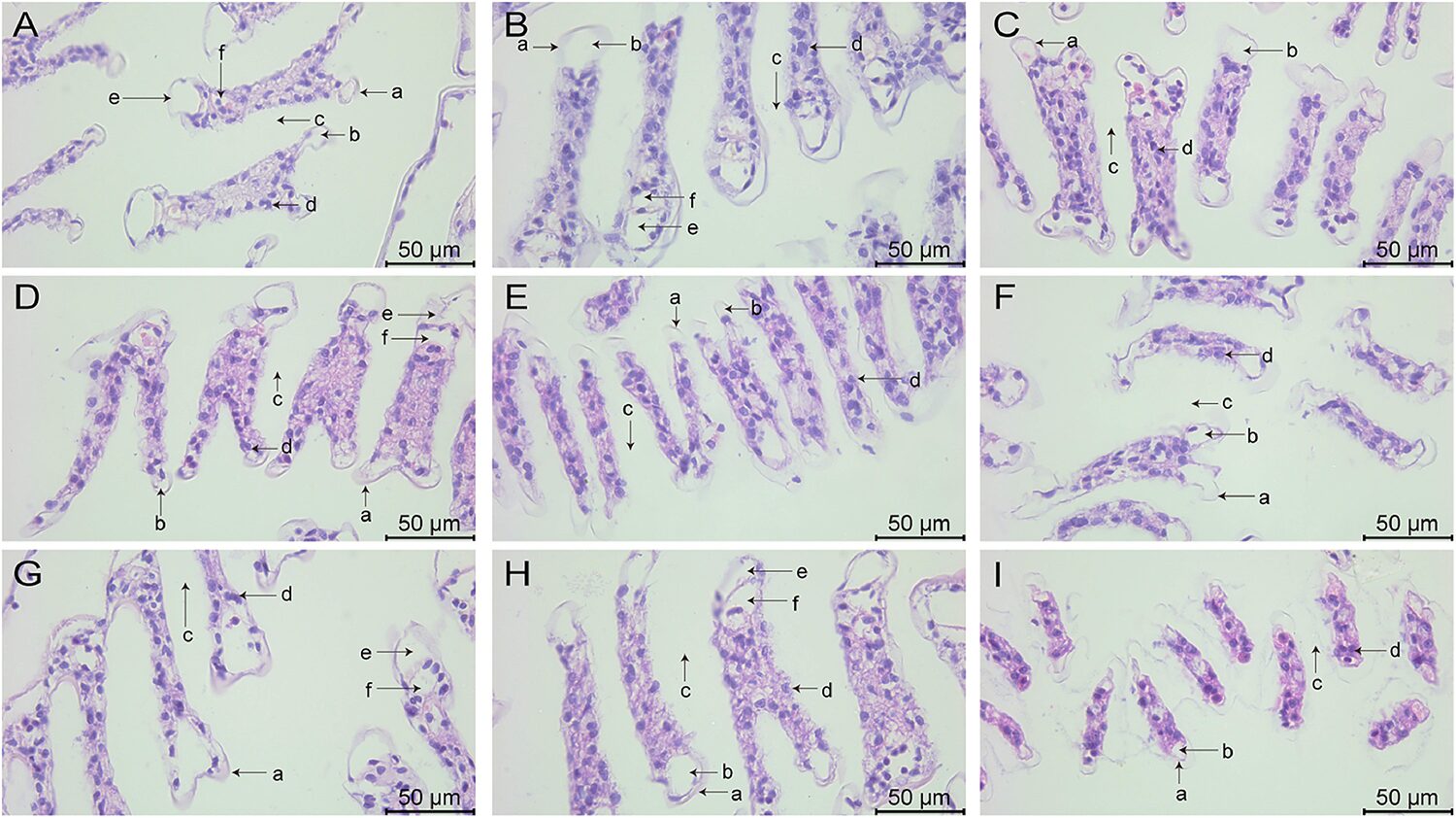 Three concentrations of nitrite resulted in progressively greater gill filament contraction and progressive thinning and rupture of the cuticle as the concentration increased, indicating progressively greater damage to the gill filaments at higher concentrations of nitrite. Nitrite was overall more damaging to gill filaments than ammonia and sulfide. The severe tissue damage caused by the high concentrations of the three stressors may further impair the excretory function of gills and lead to the accumulation of toxic metabolites. Future research could further validate these hypotheses by detecting the activity of ion regulation-related enzymes and the expression of genes associated with excretory function in the gills.