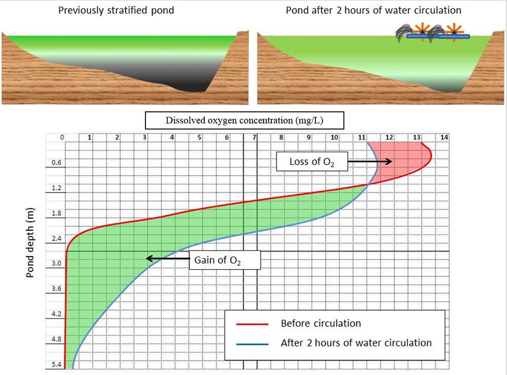 La estratificación de un estanque limita el suministro y la disponibilidad de oxígeno en los estratos superiores de la columna de agua. Por la noche, esta reserva limitada de oxígeno se consume rápidamente por la respiración del plancton, peces y/o camarones, una variedad de microorganismos, y la oxidación de compuestos reducidos en el suelo del fondo del agua y el estanque. Para evitar el déficit de oxígeno, los productores de peces a menudo proporcionan aireación a los estanques durante la noche. En los estanques de camarones, los productores también encienden los aireadores por algunas horas durante el día para aumentar los niveles de oxígeno y la calidad general del agua de fondo y suelos del fondo del estanque, pues el camarón explota alimento natural y se alimentan de pellets que se hunden a esta zona.