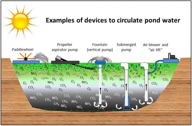 Muchos estanques acuícolas requieren aireación mecánica tanto para aumentar los niveles de oxígeno disuelto como para favorecer la mezcla de las aguas ricas y pobres en oxígeno, que también ayuda a prevenir el volteo.