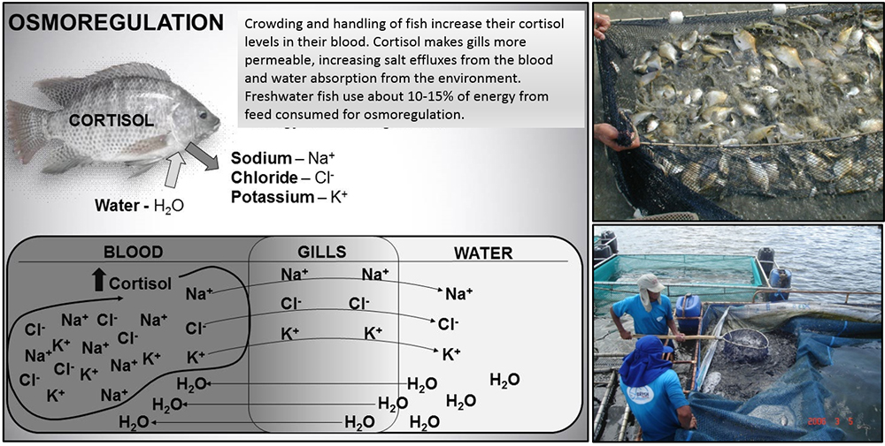El balance de la sal de los peces puede verse afectado negativamente por las lesiones físicas causadas por el hacinamiento y la manipulación durante la recolección, clasificación, pesaje, recuento, carga, transporte, el desove artificial y otras actividades de producción de peses. El hacinamiento extendido en redes y tanques desencadena respuestas hormonales y fisiológicas que provocan pérdidas excesivas de sales (Figura 1). Lesiones e inflamación de branquias causadas por parásitos e infecciones bacterianas, sólidos en suspensión (arcilla u orgánicos), y productos químicos irritantes (tales como formalina y el permanganato de potasio), así como la frecuente exposición a bajos niveles de oxígeno, también pueden hacer más difícil la osmorregulación. En estas situaciones adversas los peces pueden perder sal hasta un punto de no retorno. Algunas especies son más tolerantes al estrés de osmorregulación que otras. Por esta razón, los productores deben ajustar sus procedimientos de manejo y las prácticas preventivas en función de las especies cultivadas.