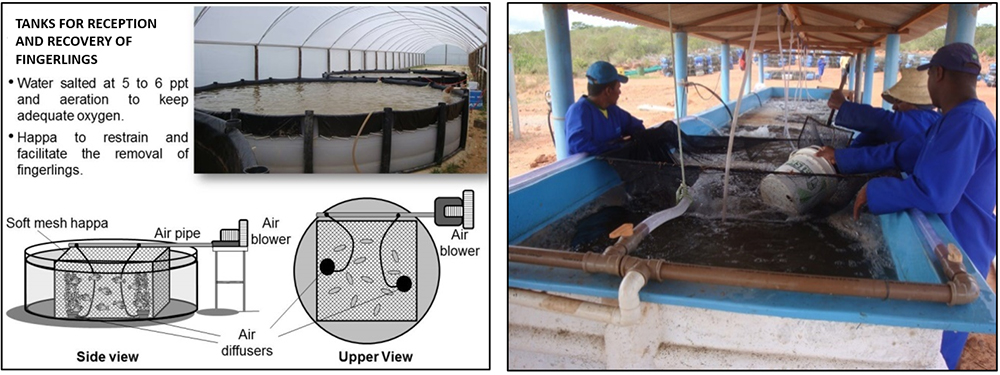 El ayunar a los peces en agua con sal, sin embargo, significa que el intercambio de agua se puede realizar en los tanques de almacenamiento. La aireación suplementaria, por lo tanto, es necesaria. Algunas especies de peces, como la tilapia y las carpas, seguirán comiendo sus propias heces fecales si este material no es expulsado de los tanques de purificación. Un sistema de recirculación que permite la recogida y eliminación de materia fecal mediante cuencas de decantación y filtros mecánicos será de ayuda. De hecho, un sistema de recirculación es muy útil, ya que el agua salada se puede mantener en buen estado y volver a utilizar de forma continua, sin la necesidad de descargarla al medio ambiente. Si un sistema de recirculación no está disponible, los productores pueden colocar a los peces dentro de hapas de malla suave (5-7 mm) para la depuración, asegurándose de que estas hapas están suspendidas alejadas del fondo del tanque para evitar que los peces consuman materiales fecales y orgánicos (Figura 2).