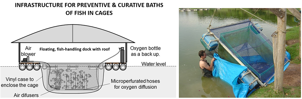 El mantener los peces en agua con 5-6 ppt de sal durante la manipulación, el ayuno y el transporte es eficaz en la prevención de infecciones por hongos y bacterias externas. Sin embargo, cuando los peces ya están infectados, los baños de sal de 20 a 30 partes por mil durante 10-30 minutos pueden ser necesarios. Cuando se cultivan peces en jaulas de pequeño volumen, los baños de sal pueden ser aplicados rodeando las jaulas con un recinto de vinilo (Figura 4). La aireación es necesaria para mantener los niveles adecuados de oxígeno dentro del recinto durante el tratamiento. Las opciones son baños de sal cortos (de 20 a 30 ppt de sal durante 10 a 30 minutos) o baños largos (de 10 a 15 ppt durante 6 a 12 horas).