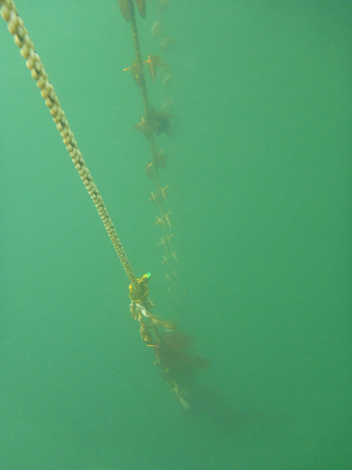 “It grows phenomenally well, probably twice as fast,” said Green, adding that ear-hanging solves a few issues while introducing others. “It’s very labor intensive, to be be drilling holes by hand. When you pay people to do that, it’s costing you a lot to grow a scallop.”