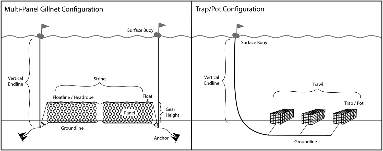 Configurations of traps and pots are generally characterized by the number of traps per trawl (the general term for multiple traps/pots on a line) and endlines. Endlines are used to connect the terminal end of a trawl to surface buoys that mark the location. Gillnets are similarly configured with endlines and one or more net panels per string. Gillnets have more complicated and variable gear configurations, often based on target species and region. Efforts to describe and quantify fixed-gear fishery density and dynamics in the U.S. Atlantic must account for these species- and gear-specific characteristics as they affect the ability of each fishery to modify or relocate gear.